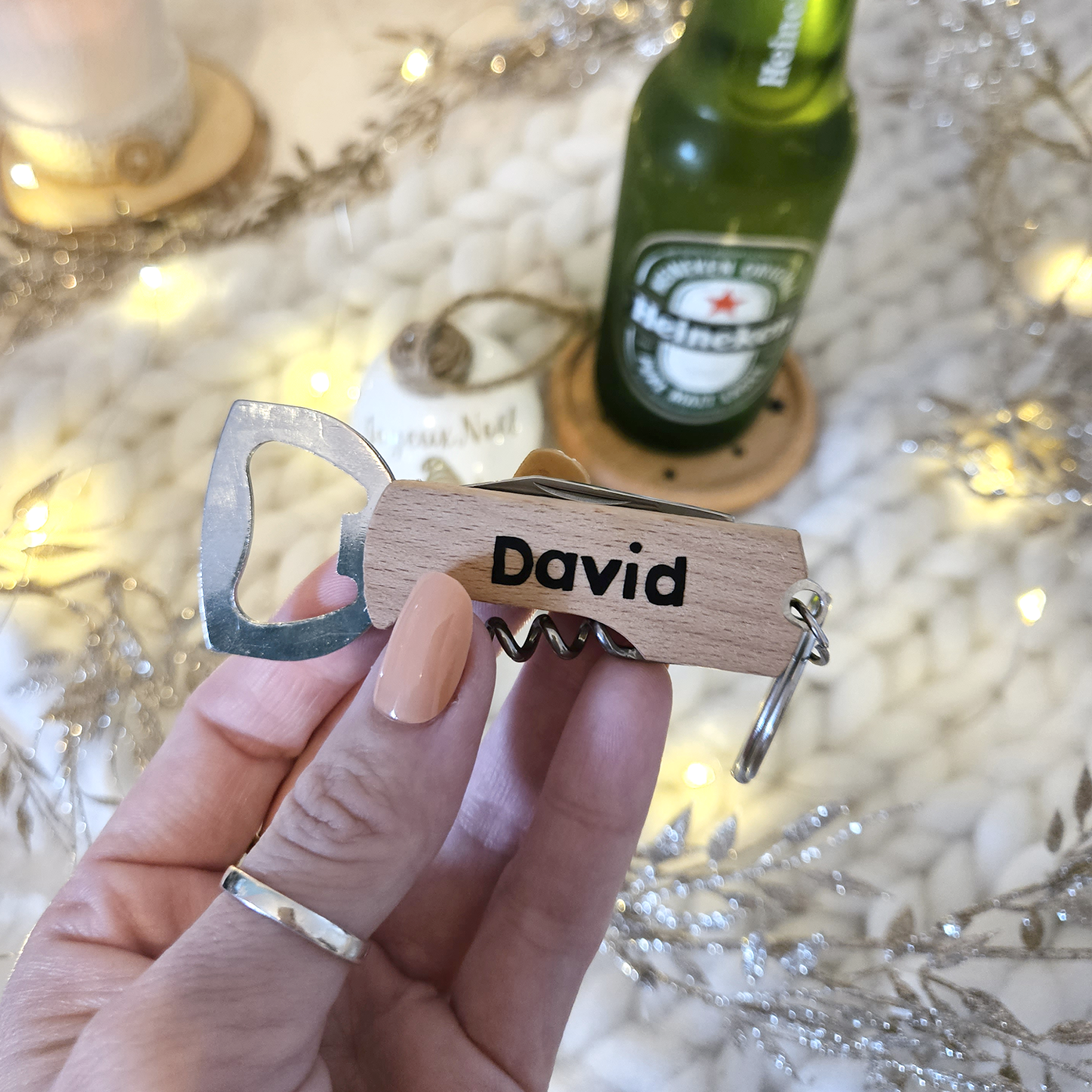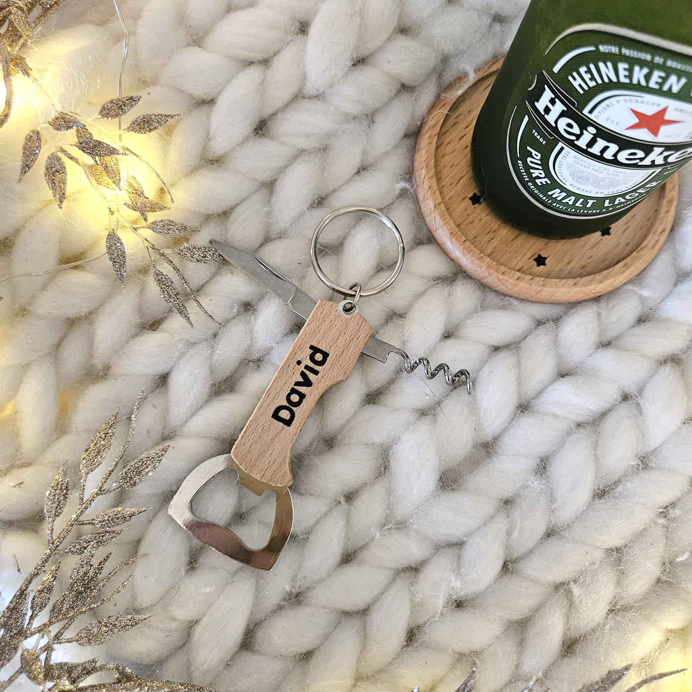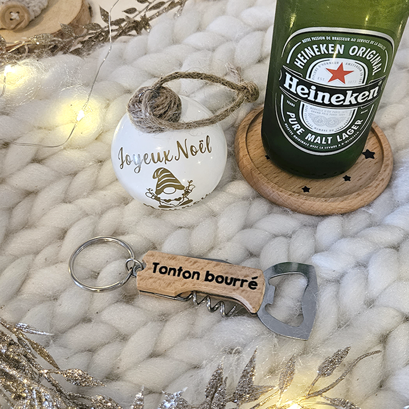 Ce décapsuleur/ouvre-bouteille porte-clé personnalisable est non seulement un outil pratique, mais il peut également être personnalisé avec un prénom ou un court texte, en faisant un cadeau de Noël unique et attentionné pour les amis, la famille ou les amateurs de boissons.